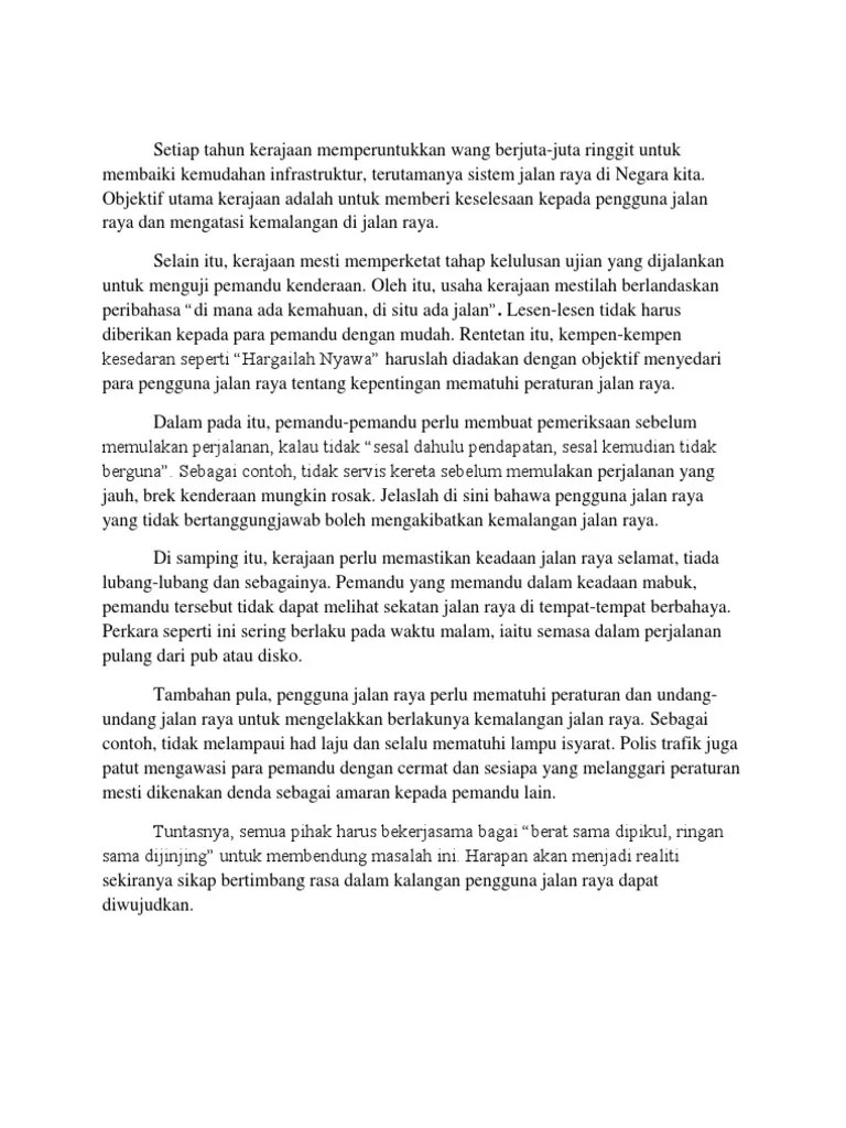 Hal ini lebih membahayakan ketika hujan kerana sewaktu hujan, . Selain itu, pemandu mesti memeriksa . Apabila tayar kita sudah haus, sudah tentu daya cengkaman kenderaan itu akan berkurangan. Sediakan teks ceramah tersebut selengkapnya. Langkah utama untuk mengatasi kemalangan jalan raya ialah mendidik para pemandu khususnya pemandu pengangkutan awam supaya lebih berdisiplin . Ini tentu boleh menyebabkan kemalangan jalan raya.